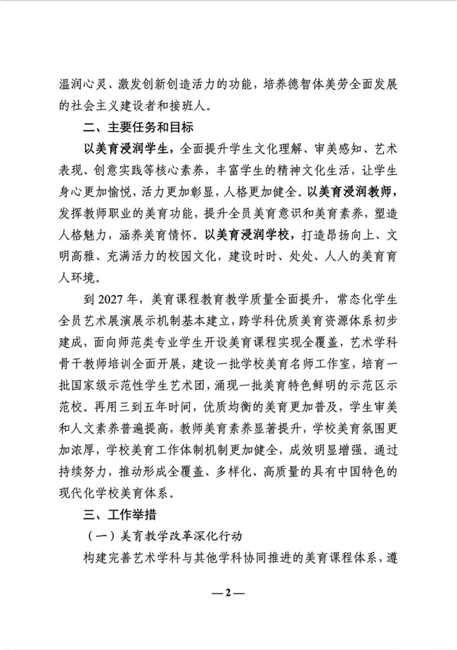 2023年12月,国家教育部印发《关于全面实施学校美育浸润行动的通知》,旨在通过美育浸润学生、教师、学校,全面提升美育课程教育教学质量。通知提出,面向人人建立常态化学生全员艺术展演机制,广泛开展班级、年级、院系、校级等群体性展示交流。推广普及高雅艺术进校园活动。
